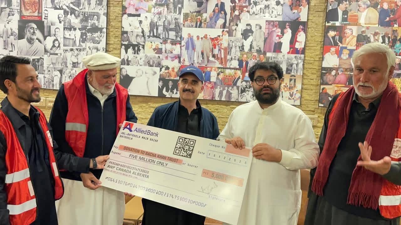 PESHAWAR: Awami National Party (ANP) Alberta, Canada, President Sherak Bar Khan, along with General Secretary Asad Khan Shahzada, Ashtar Khan, Hussain Ali Sena, Mia Ji, Khadim Shah, and other members, presented a cheque of Rs50 million to support welfare initiatives.
