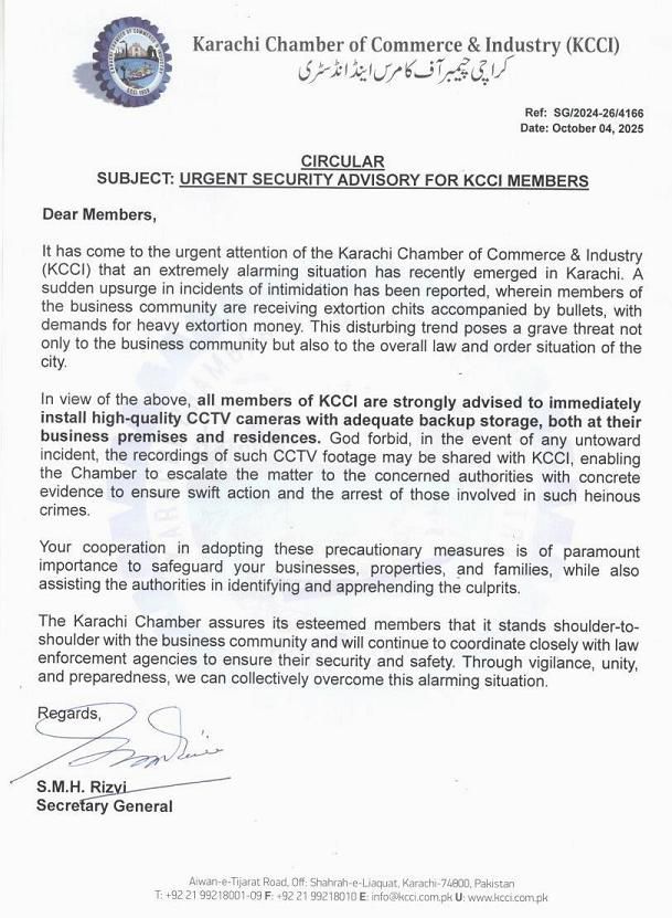 ISLAMABAD – The business capital of Pakistan is once again in the grip of fear. A chilling wave of extortion threats has swept through Karachi, with members of the business community reportedly receiving extortion chits enclosed with live bullets, demanding huge sums of money. The Karachi Chamber of Commerce & Industry (KCCI), in an urgent circular issued to its members on October 4, 2025, confirmed the alarming development and warned that the situation poses a grave threat to both the business community and the overall law and order of the city. According to the KCCI circular (Ref: SG/2024-26/4166), the Chamber has strongly advised traders to install high-quality CCTV cameras with sufficient backup storage at both their commercial and residential premises. The Chamber urged members to share any relevant footage or evidence with KCCI immediately, enabling the organization to escalate the matter to authorities with concrete proof for swift action.