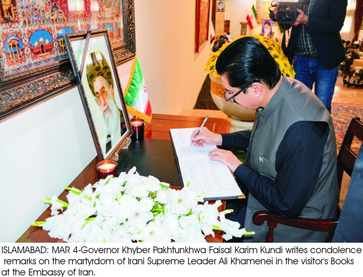 ISLAMABAD: Faisal Karim Kundi, Governor Khyber Pakhtunkhwa, accompanied by former Federal Minister Sajid Hussain Turi, visited the Embassy of the Islamic Republic of Iran in Islamabad on Wednesday to offer condolences on the martyrdom of Iran’s Supreme Leader, Ayatollah Seyyed Ali Khamenei.